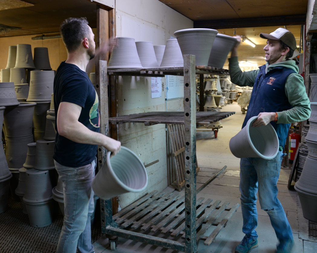 Our pots are hand thrown on the wheel using an ancient ‘three-pull’ technique. This has been passed down for generations from Fred Whitbread, Reg Harris and their ancestors to Jim and now to Adam and his team. It takes a thrower over fifteen years to truly master the material and one of the great strengths of old English Potteries and Whichford alike is the ability to train a team of potters to consistently produce flowerpots that are as beautiful as the original over and over again.