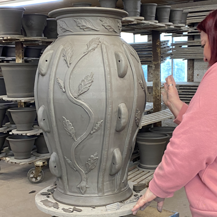 The largest pots we make are produced in up to seven sections, all hand thrown from large coils with specially designed bats and bespoke wheels to enable Adam and the team to reach heights only restricted by the size of our kilns.