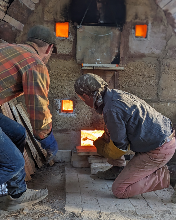 The entire process of firing our Kiln, from loading to unloading takes around four weeks and involves a dedicated team of skilled stokers. Once the kiln is carefully loaded and sealed, over the next several days, potters continually stoke the fire with wood, first from the front firebox and then slowly drawing the heat down and back using the side stoke holes until it reaches the optimum temperature.