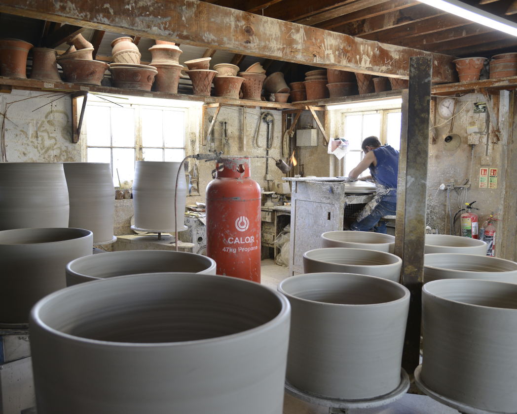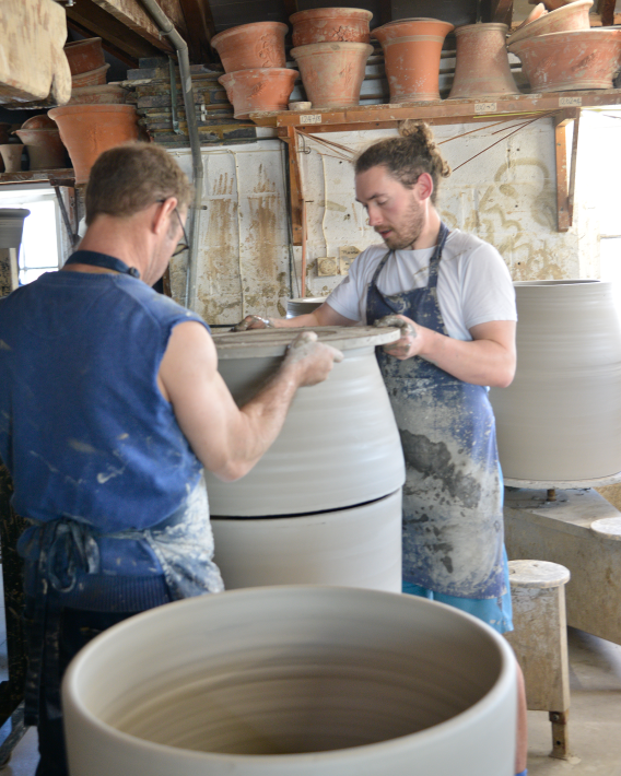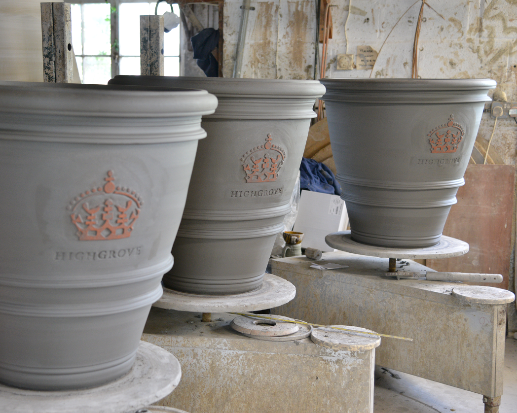 We are proud to supply the Royal Parks with pots for their gardens. Adam has been busy making a set of two large bespoke planters for Bushy Park. After he has thrown the pots and using the cast of Jim’s original clay carving, the decorators carefully add the Royal Parks marque to the pots…