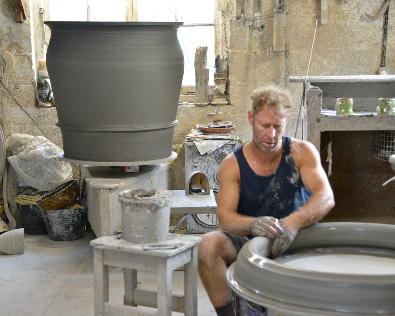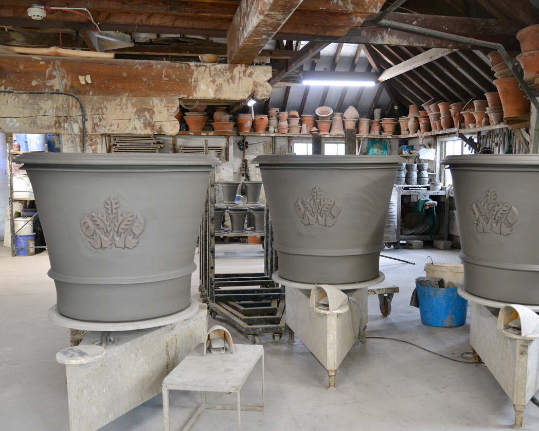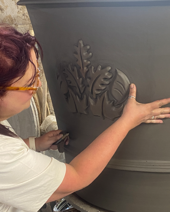 We are proud to supply the Royal Parks with pots for their gardens. Adam has been busy making a set of two large bespoke planters for Bushy Park. After he has thrown the pots and using the cast of Jim’s original clay carving, the decorators carefully add the Royal Parks marque to the pots…