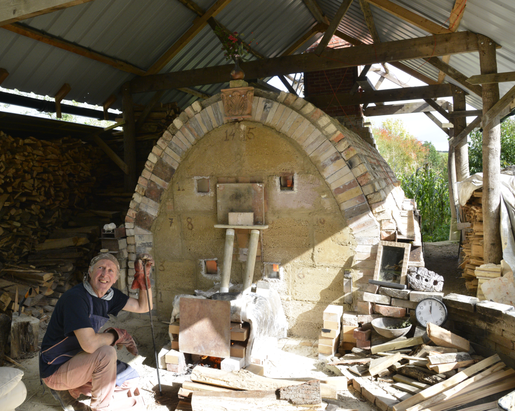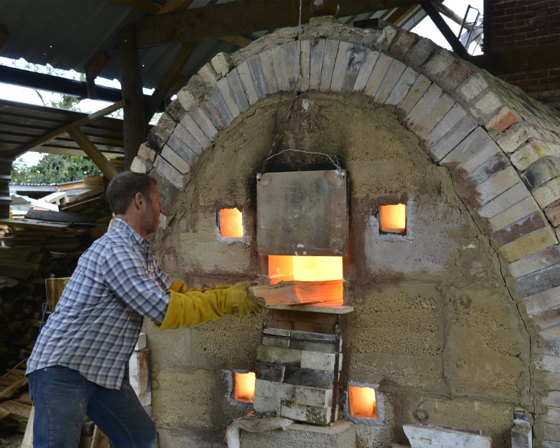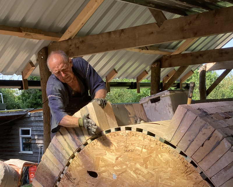 Unusually, it is large enough to walk into upright and is built with a flat floor rather than the more typical stepped ‘climbing’ design. This allows for the easier loading of larger pieces. Many of the materials used in its construction were reclaimed — the substantial arch bricks, kindly given to Jim by his friend David Garland, originally formed part of a nineteenth-century Cotswold circular lime kiln.