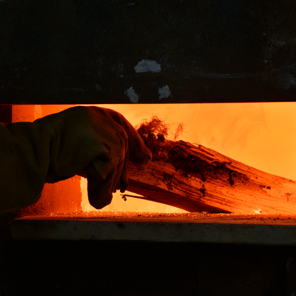 The firing begins gently, allowing any remaining moisture to leave the clay before the temperature is steadily raised. Over the following days, the kiln is kept alive through constant stoking, done in six hour shifts by our team. We use local wood, mainly pine off-cuts with some oak, feeding them rhythmically into the main fire box, side and top stoke holes to sustain and build heat. The aim is to create a rolling sweep of flame from front to back, drawing heat and ash through the chamber and across every surface. As the kiln climbs towards peak temperature, stoking rhythm speeds up, with up to five stokers working closely as a team – a medieval scene of shooting flame and smoke, with the kiln finally coming to life, with a deep, insistent roar. After all of this it will be ten nervous days waiting for the kiln to cool before unloading can begin…